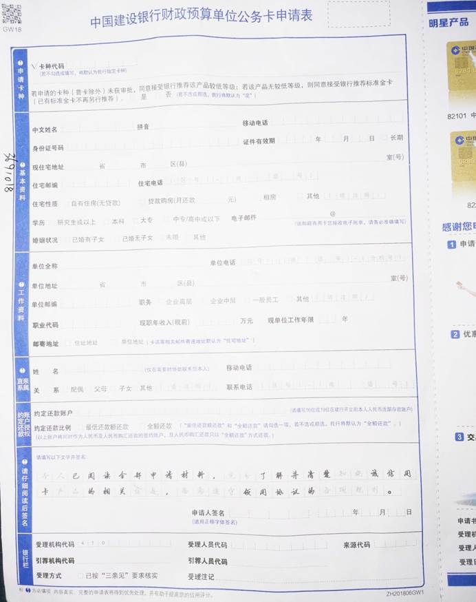 1.公务卡申请表(如果财务处没有可以到建行北支领取)